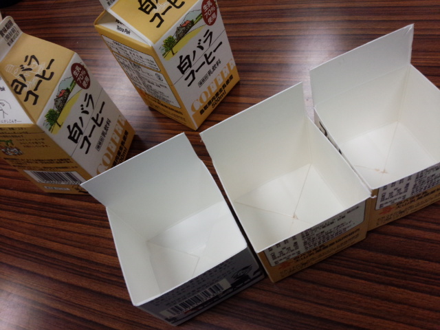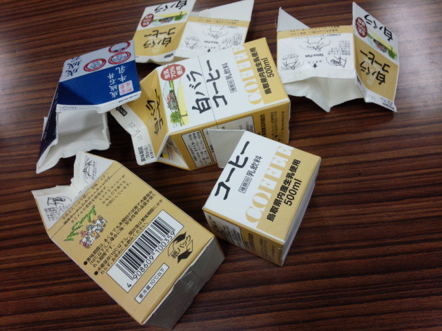 牛乳パックを使っての工作の準備です。白バラコーヒーのパックが多いです。