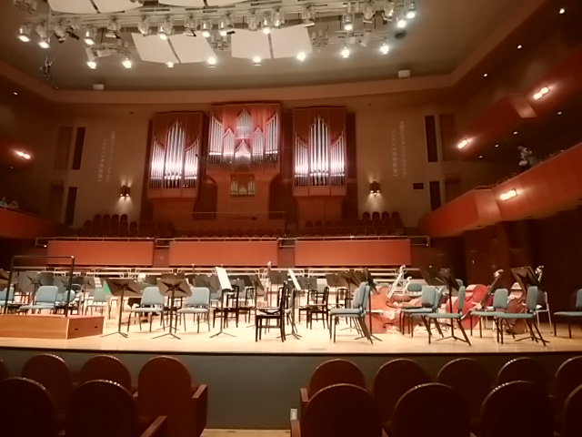 ホールです。誰もいないと思ったのでスマホで撮影したのですが、一人だけ演奏者がチューニングしていたようで係の人から注意されてしまいました。実際この写真でもわからないのですが、このあと一人の方が立ち上がったので気づきました。正面にたくさんの合唱の方が並んですごい迫力でした。