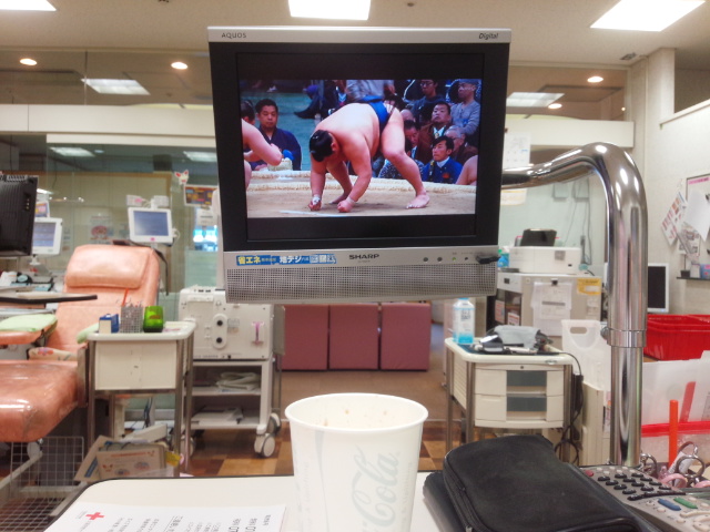 茨木の献血ルームで大相撲中入り後の勝負をじっくりと見ました。まさに至福の時のはずだったのですが、ここのところの寝不足のせいかウトウトとしてしまったようです。腕に針が刺してあるので眠ってしまうのはちょっと危険なのでしょうが、どこか目覚めているところがあって左手は大人しくしてくれていたようです。
