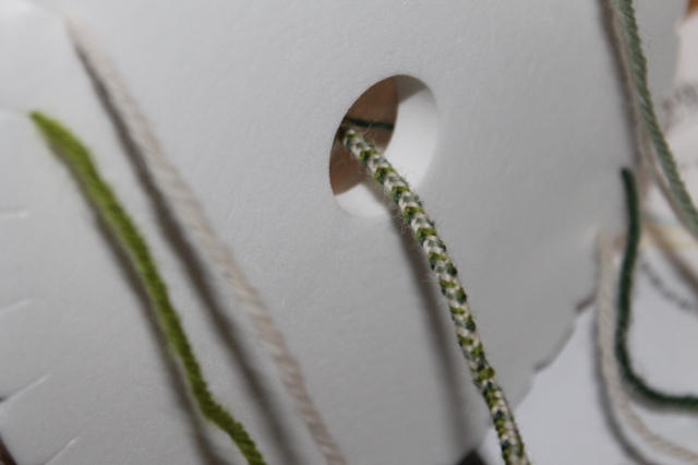 ディスクの裏からかなりしっかりした組みひもが登場してきました。これをどうやってミサンガとか、根付き紐にすればいいのかがわかりません。