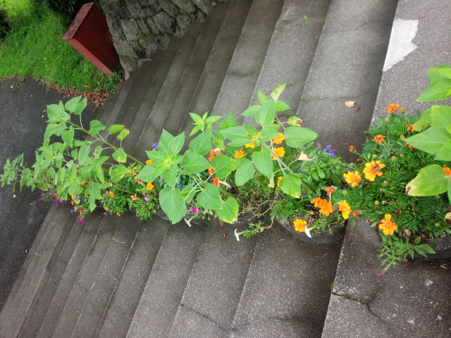 学校へ上がる階段にはひまわりとマリーゴールドの鉢が並べられていました。金、土、日、月と営業しているのですが、この食堂のお兄さん達は火、水、木と何をしているのか少し気に掛かりました。畑や花の世話をしているのでしょうか?