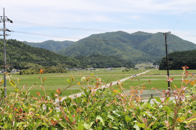 昨日のくもベ小学校の駐車場付近から眺めた篠山の田園地帯の風景です。田んぼの真ん中に斜めに一本道が走っていて自動車が山の中に吸い込まれるように走っていきました。その後を負うようにもう一台の自動車が走っています。