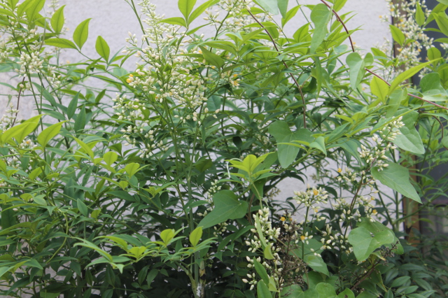 ナンテンの花が咲いていました。こんなに小さく咲いて小さな赤い実をつけるのですね。
