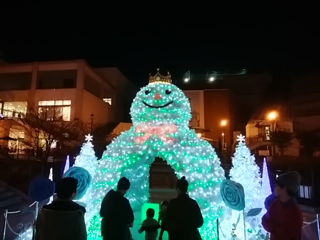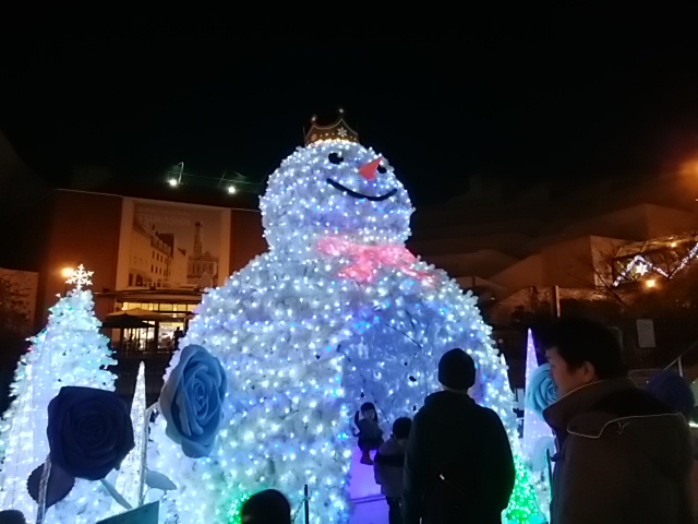 到着したとき、まだ明るかったので、白い大きな雪だるまに見えて本物の雪かと思ったのですが、暗くなって明かりがつくと見事な雪だるまになっていました。