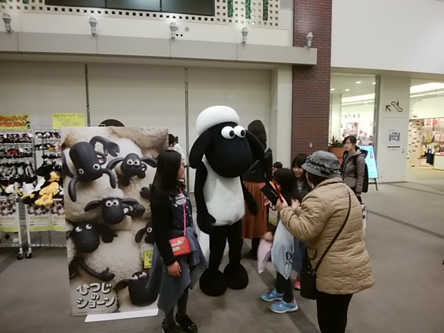 無印良品のお店の前に『羊のショーン』が来ていました。立っているショーンに少し驚きましたが、子どもたちが近寄って記念写真を撮っていました。