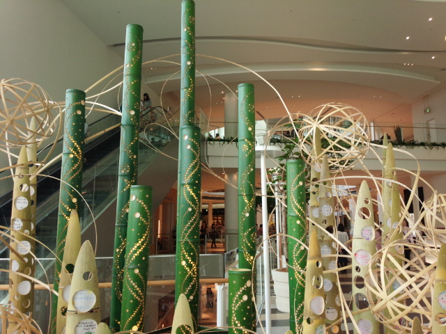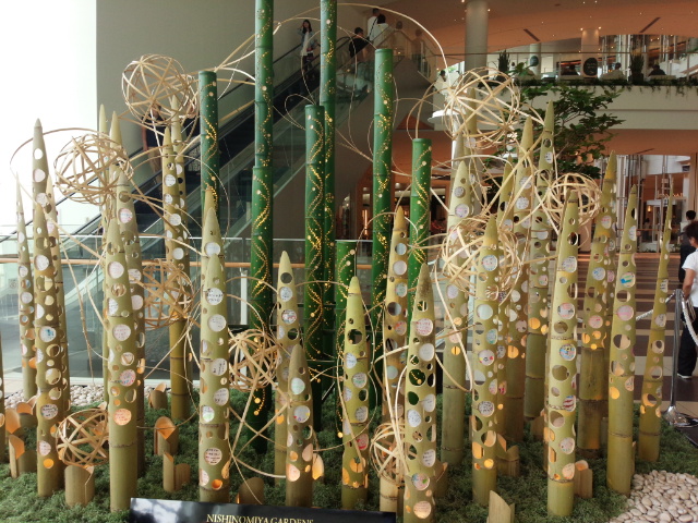 西宮(にしのみや)ガーデンズで見(み)かけたおしゃれな七夕(たなまた)飾(かざ)りです。竹(たけ)を使(つか)って円(まる)い窓(まど)を作(つく)ってそこに願(ねが)い事(ごと)が書(か)かれています。