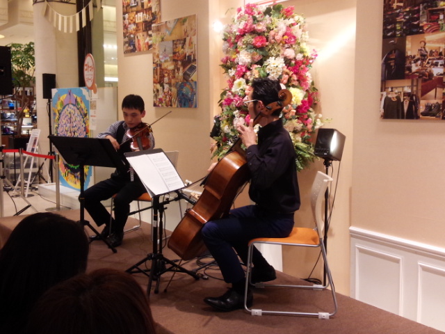 西宮ガーデンズの中にある阪急百貨店でバイオリンとチェロの二重奏を演奏していました。