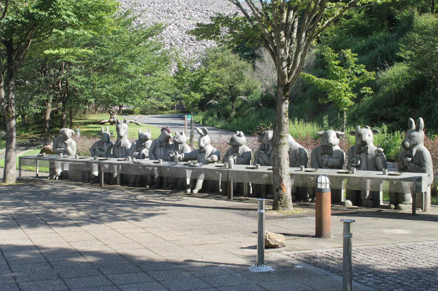 あさご芸術の森美術館の玄関前を飾る動物たちです。題名は「最後の午餐に集合した一同」です。有名な最後の晩餐を動物たちに置き換えて面白おかしく表現されています。左から二人目が空白になっていますが、そこには訪れた人が並んで座って写真を撮れるようになっています。木が邪魔でうまく全員を撮るのは至難の業のようです。5年前の8月に訪れた時の写真です。