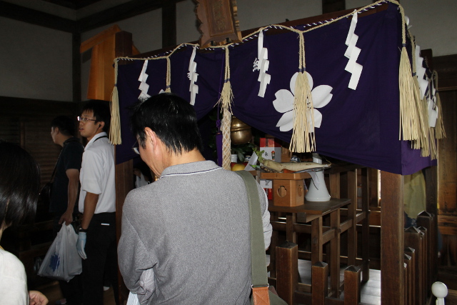 あの最上階の天守閣6階は床面積がかなり少なくて小さな神社もあるのでたくさんの人が一度に入るのは限界があるそうです。3階のガードマンの話だと最大で180人まで上がれるそうですが、そうなると床が見えないそうです。
