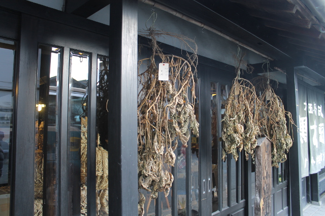 篠山(ささやま)の小田垣(おだがき)商店(しょうてん)の店(みせ)の前(まえ)に下(さ)げられた黒大豆(くろだいず)です。
