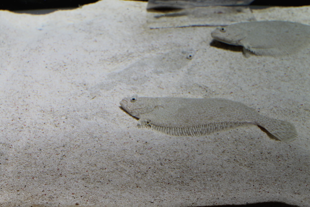 ヒラメの擬態の様子です。そこの砂の色に体の色を変化させて目だけぎょろぎょろさせて様子をうかがっていました。
