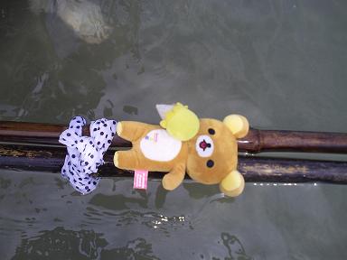 3年前(ねんまえ)の8月(がつ)に竹(たけ)の筏(いかだ)に乗(の)ったブナピー(りらっくま)です。
