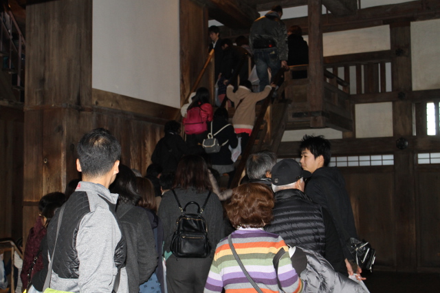元日だけはお城にの天守閣に無料では入れるということでたくさんの人が押し寄せたみたいです。私も大阪から駆けつけた口なのですが。階段が狭いので5階6階と天守閣の人が降りてくるのを待って上がるという規制がかかっていました。