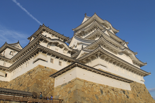 登城を終えて三の丸広場に戻ってくるとお城の後ろにくっきりと飛行機雲が伸びていました。