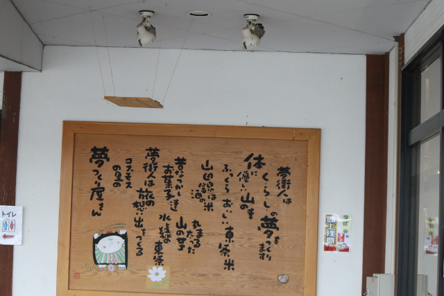 凄(すご)い雨(あめ)を抜(ぬ)けて能勢(のせ)から篠山(ささやま)へ行(い)き、雨(あめ)が上(あ)がって気持(きも)ちよく山(やま)の景色(けしき)を眺(なが)めながら気(き)がつくと道(みち)の駅(えき)『東条(とうじょう)』まで足(あし)を伸(の)ばしていました。この看板(かんばん)は東条(とうじょう)のお米(こめ)、山田錦(やまだにしき)を湛(たた)えていますね。