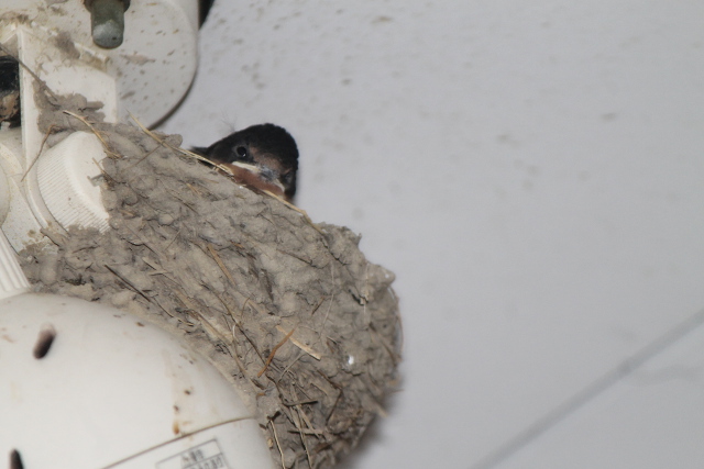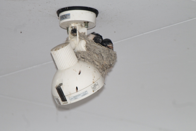 ふと見上(みあ)げるとライトの上(うえ)にツバメの巣(す)がありました。