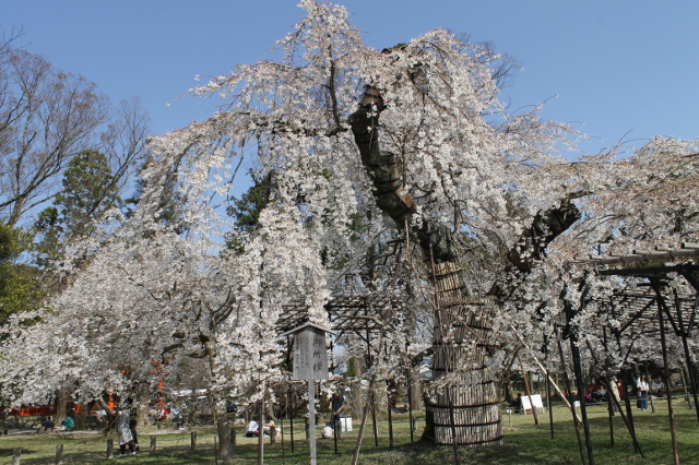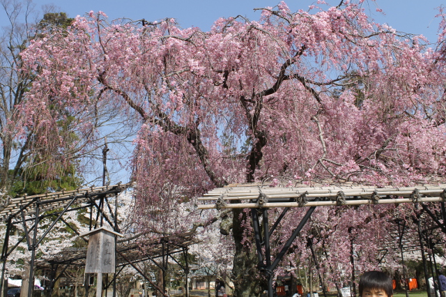 斎王桜という看板が掛かっていました。ピンクの枝垂れ桜の花が屋根の上にどっさりと横たわっていて花にも重さがあるんだなあとつくづく思いました。