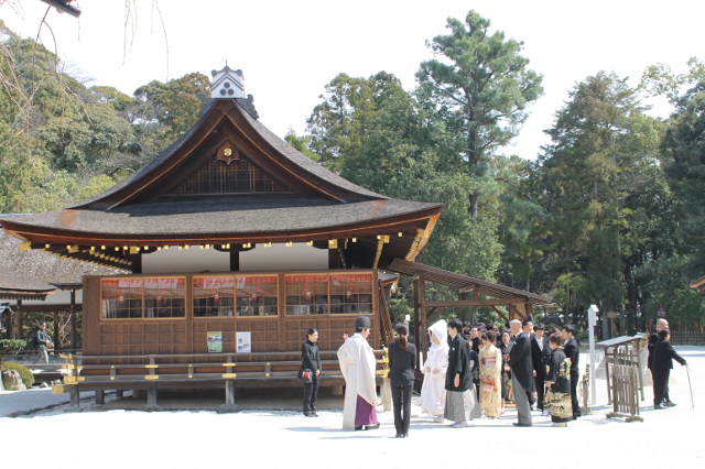 上賀茂神社で見かけた白無垢の花嫁さんです。たくさんの黒い服の人や艶やかな振り袖姿の人たちを引き連れて花嫁さんはすごく目立ちますね。