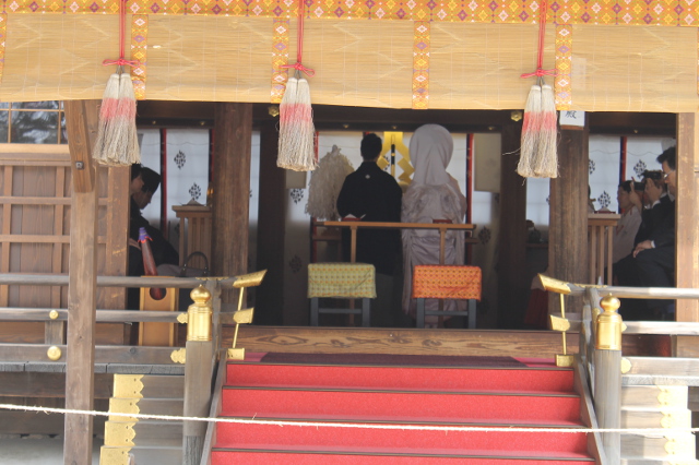 円錐形の立砂が二つ並んだ細殿(ほそどの)での挙式です。