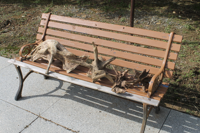 土曜日(どようび)に訪(おとず)れた白毫寺(びゃくごうじ)の九尺藤(きゅうしゃくふじ)の前(まえ)のベンチで見(み)つけました。木(き)の根(ね)っこがベンチで乾(かわ)かされていました。暖(あたた)かい秋(あき)の陽射(ひざ)しを浴(あ)びて気持(きも)ちよさそうでした。