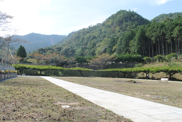 九尺藤(きゅうしゃくふじ)の藤棚(ふじだな)の遠景(えんけい)です。藤棚(ふじだな)の前(まえ)に大(おお)きな石(いし)の仏像(ぶつぞう)が十三体(じゅうさんたい)ずらりと並(なら)んでいました。