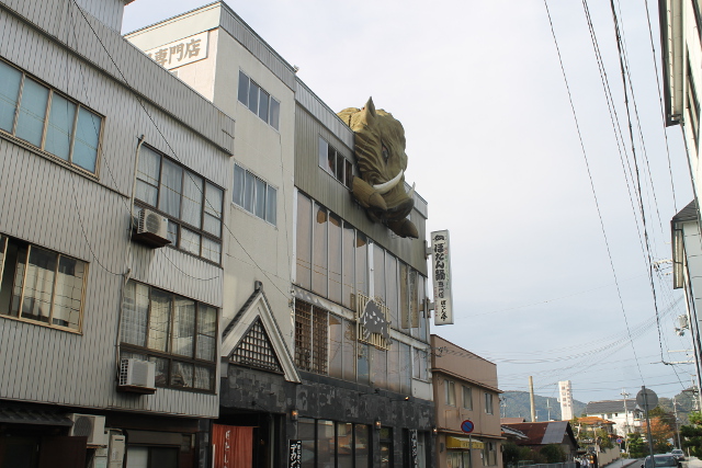 ビルの屋上(おくじょう)から大(おお)きなイノシシの顔(かお)が覗(のぞ)いています。ぼたん鍋(なべ)のお店(みせ)です。