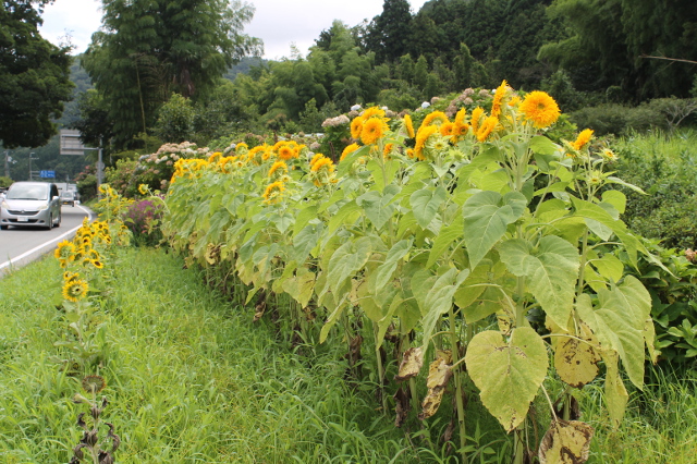 その一本杉から少し歩いて南に戻ると向日葵畑がありました。ずらり並んだ向日葵が見事に咲いていました。ただこの撮影は次から次と能勢方面からクルマが来るので半ば命がけでした。