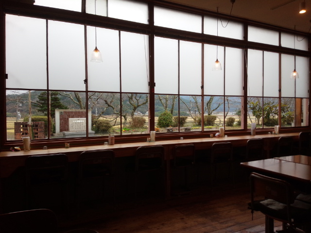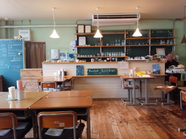 くもベ小学校の旧職員室です。右奥に座っているのがこの工房レストランの校長先生みたいな人です。机も椅子も黒板も、ここの卒業生たちが見ると懐かしいでしょうね。