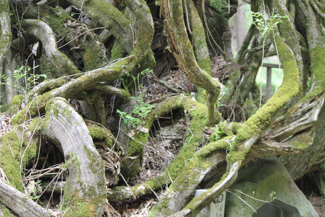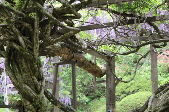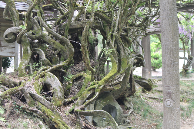 棚から下がる美しい藤の花に比べて土から出ている木の幹の部分はおどろおどろしい姿をしていました。