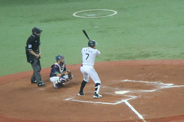 内野上段7-404という席で、かなり上の方から見下ろす感じの場所でした。糸井選手の打席です。ホームランを期待したのですが、この日は残念ながら打ちませんでした。