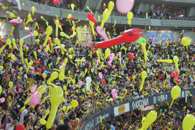 7回の風船上げです。それにしてもパンパンパンパンと風船が割れる音が球場をこだましていました。6回裏のツーアウトからは本当にひっきりなしに割れる音が続いていました。