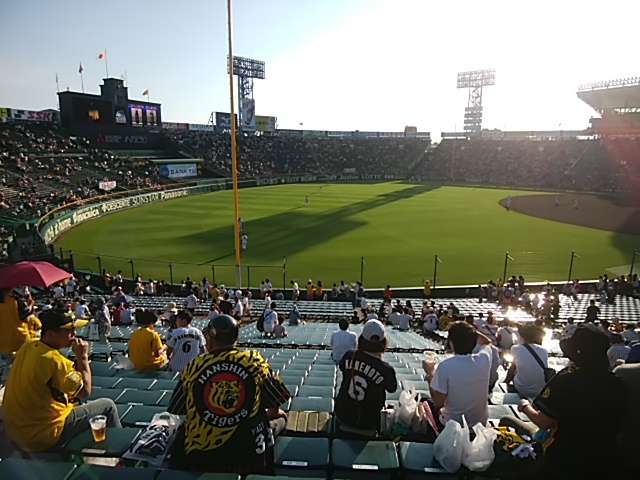 夕方五時ぐらいの甲子園球場です。西日が眩しくて入場の時にもらった小さなうちわで太陽の光を遮りながらグラウンドで練習する選手の様子を見ています。