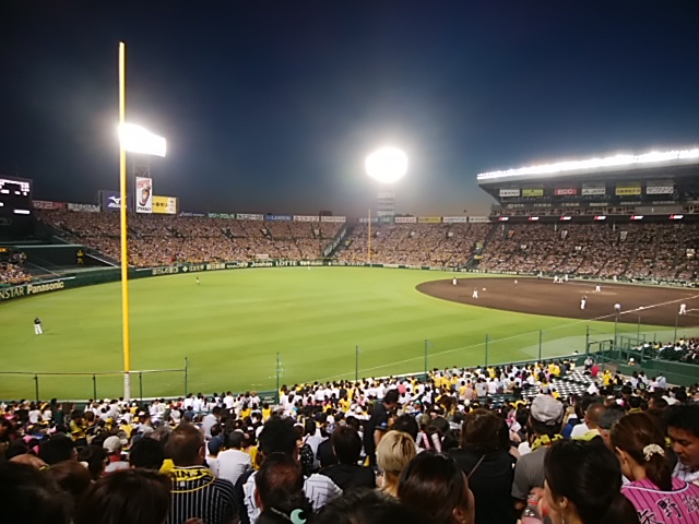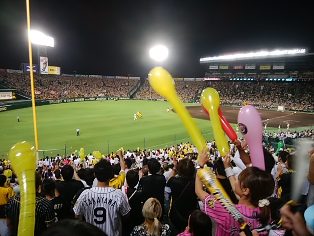 糸井のサヨナラホームランで歓喜の渦でした。球団気を持ってグラウンドの真ん中で六甲おろしの準備に走るトラッキーです。六甲おろしを歌いながら風船を膨らませる人がいて歌い終わるとかなりの風船が飛びました。