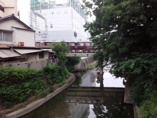 阪急石橋駅で途中下車しました。何とも言えぬ懐かしい商店街でおじいさんが捏ねて揚げたテンプラを買いました。『何がおすすめですか?』と尋ねると『人によって好みがちがうから』とすごく正直なおじいさんでした。赤い橋の上から川の上を通過する阪急電車を撮影しました。