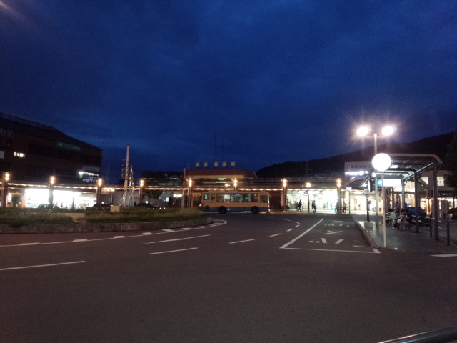 阪急(はんきゅう)箕面駅(みのおえき)の夜景(やけい)です。駅(えき)から一番(いちばん)離(はな)れているバス乗り場(のりば)から撮影(さつえい)しました。正面(しょうめん)向(む)かって右手(みぎて)の奥(おく)の方(ほう)に石造(いしづく)りのゆずるクンがいます。