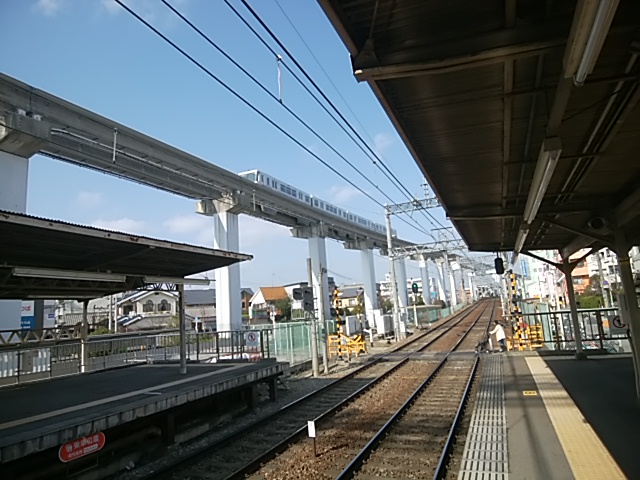 阪急蛍池のホームに立って上の方を見るとモノレールが走っていました。空港からやってきて、千里中央方面に向かっていきました。