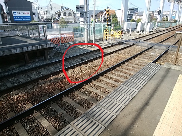 しばらくして、下の方に何やら動いているものが目に入りました。一羽のカラスが線路の上をトコトコトコトコ歩いてきていました。向こうの線路にカラスが見えるのがわかりますか?