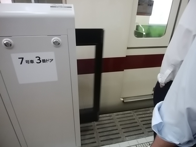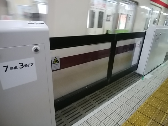 北大阪急行の千里中央の駅ホームに防護柵がつきました。9月9日の土曜日から稼働しているそうです。黒っぽい枠に透明な板、電車が入ってくると左右に開きます。