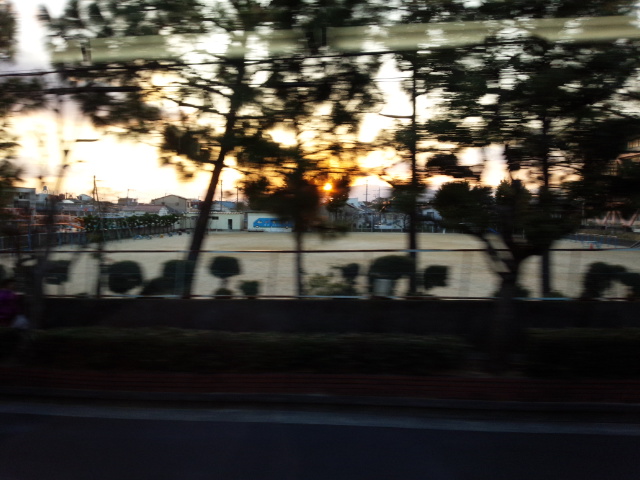 走る電車の中から夕陽を撮影しました。かなりのスピードだったのですが、木の向こうに夕陽が写り込みました。
