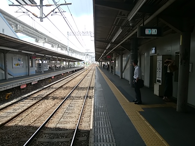 阪急電車の蛍池駅の構内です。暑い昼間なので線路も曲がりそうです。向こうのほうは石橋、池田の方向で宝塚まで伸びています。一方、後方は梅田まで伸びています。