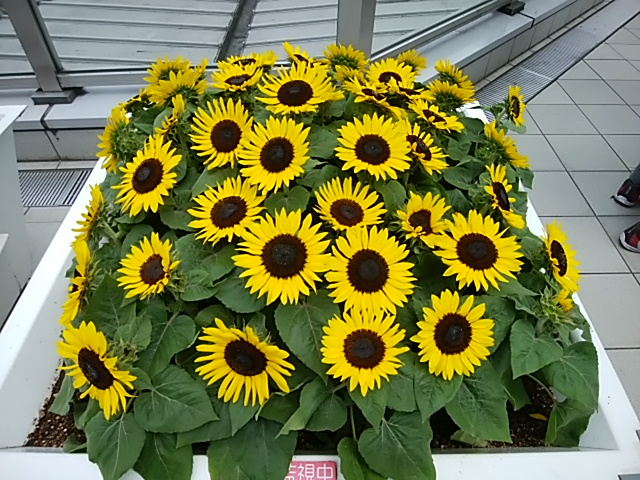 JRの大阪駅の中央口を上がったところにあるカリヨン広場の花壇です。矮性のひまわりがぎっしりと並べられて道行く人が「ほんものや!」と言いながら眺めていきました。