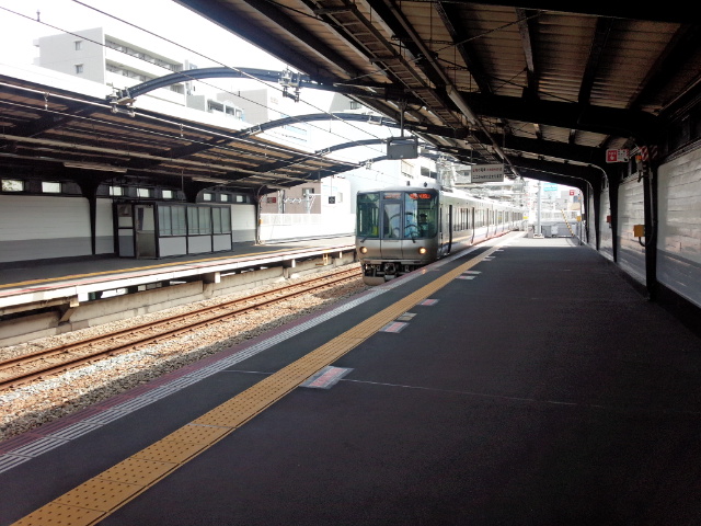 森ノ宮(もりのみや)の駅(えき)がきれいに改修(かいしゅう)されて美(うつく)しくなりました。関空快速(かんくうかいそく)、和歌山(わかやま)行(い)きが入(はい)ってきました。