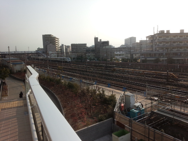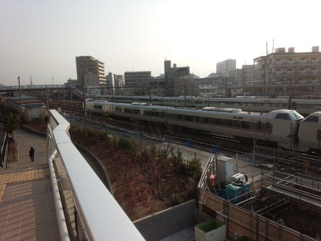 高槻駅近くの跨線橋から少し外れたマンションへの通路のところで京都方面からやってくる列車を撮影しました。この場所から線路を眺めていると、昨年なくなった友人のMさんが鉄道が好きだったのを思い出しました。天国に行ったMさんのために急いでシャッターを切りました。