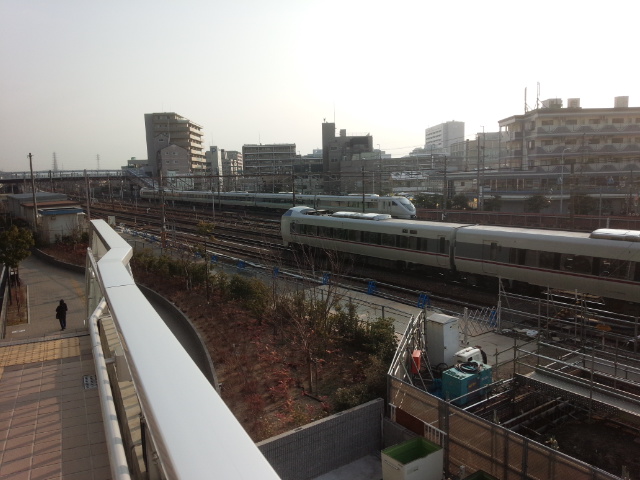 向こうから来る列車は特急ですね。京都方面に行くのも普通の快速電車ではないような気がしました。