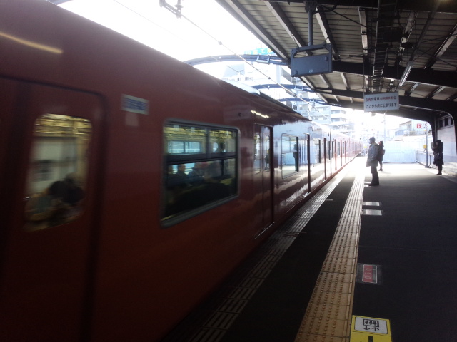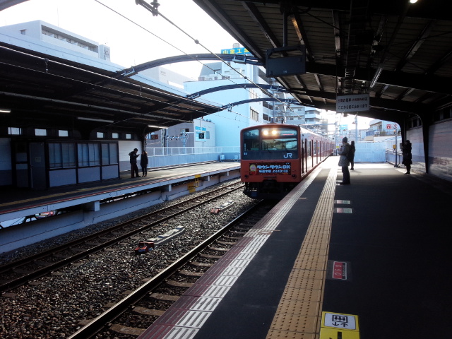 これまでの大阪環状線の車体です。少し曇った冬空の下、ライトを点灯させて森ノ宮駅構内に入ってきました。