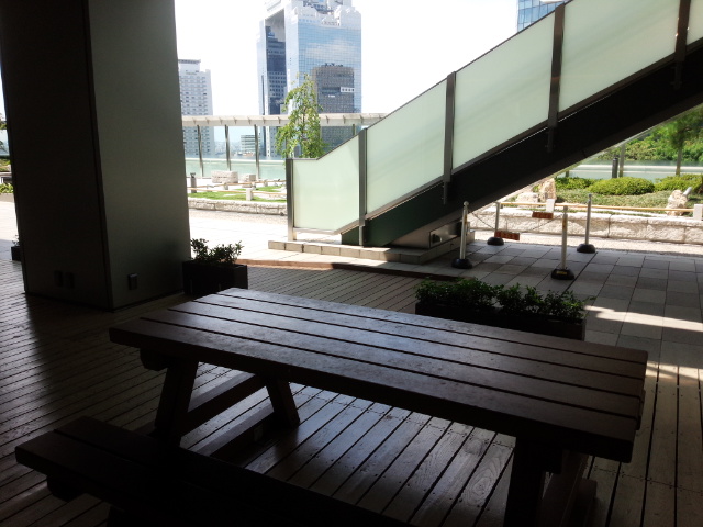 この前も行ったのですが、JR大阪駅からエスカレーターをルクアを見ながらどんどん上がっていったところです。エアコンが効いていないので暑いことは暑いのですが、10階の風が心地よかったです。そのうえ、このように落ち着いたテーブルが置かれてお弁当を食べるには絶好の場所だと思います。