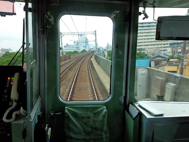 阪神電車(はんしんでんしゃ)の梅田(うめだ)発(はつ)姫路(ひめじ)行(い)き直通特急(ちょくつうとっきゅう)の最後尾(さいこうび)の車両(しゃりょう)から撮影(さつえい)しました。