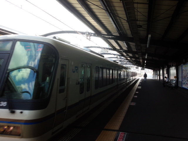 森ノ宮駅に入線してきた大和路快速です。ホームの向こうは夏の太陽が照り付けてぎらぎらと明るかったせいかホームの屋根の下が暗く見えました。暗い所からすごい勢いでホームに入ってきて一瞬通過車両かなと思うぐらいの速さでした。