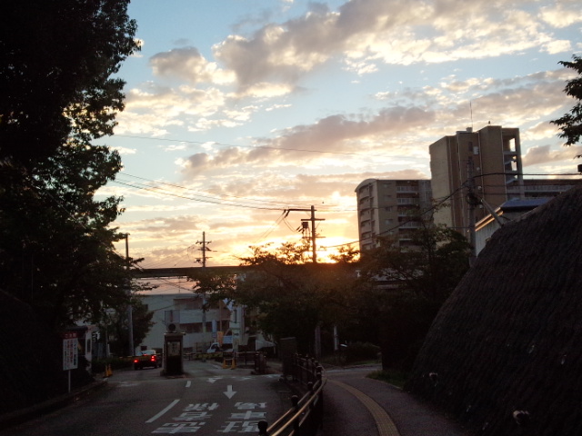 きれいな黄金色の夕焼けが坂道の突き当たりに見えました。モノレールの線路の向こうが輝いていました。