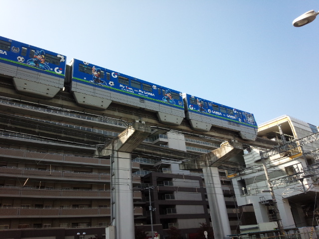 見上げるとガンバ大阪を応援しているモノレールが空港の方へ走っていきました。